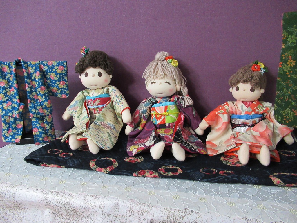 古い着物で三姉妹が出来上がり、髪飾りもピンセットで折った摘み飾りで♡